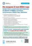 Не позднее 2 мая 2024 года необходимо предоставить налоговую декларацию по форму 3-НДФЛ о доходах, полученных в 2023 году.